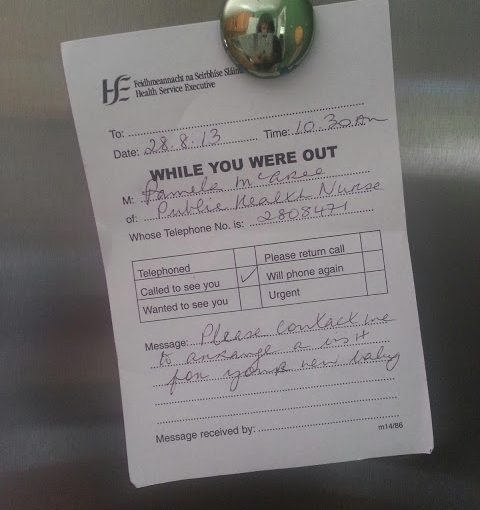 Eu tive a Amy de cesárea – só depois de entrar em trabalho de parto (vou contar em um outro post como foi, prometo!) e por isso passei 5 dias no hospital, como acontece com todo mundo que faz cesárea, mas depois de 3 dias já estava recebendo em casa a visita de uma Enfermeira do HSE, mas como eu não estava ela deixou uma nota avisando da visita e umas 5 ligações e recados no meu celular. (pelo desespero e preocupação ela devia estar pensando que depois do 4º filho eu resolvi fugir, né?)