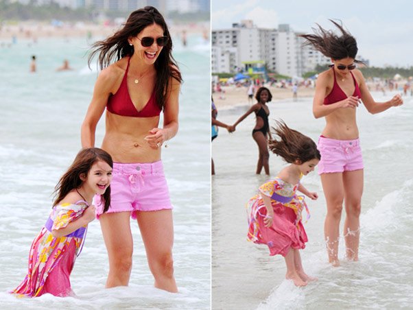 “De biquíni, Katie Holmes exibiu uma barriga ‘estranha’ (de grávida, com estria?) neste sábado e parece que ela não se importou com esse detalhe”