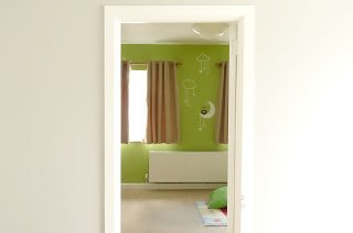 As cores das paredes, de branco para verde.
